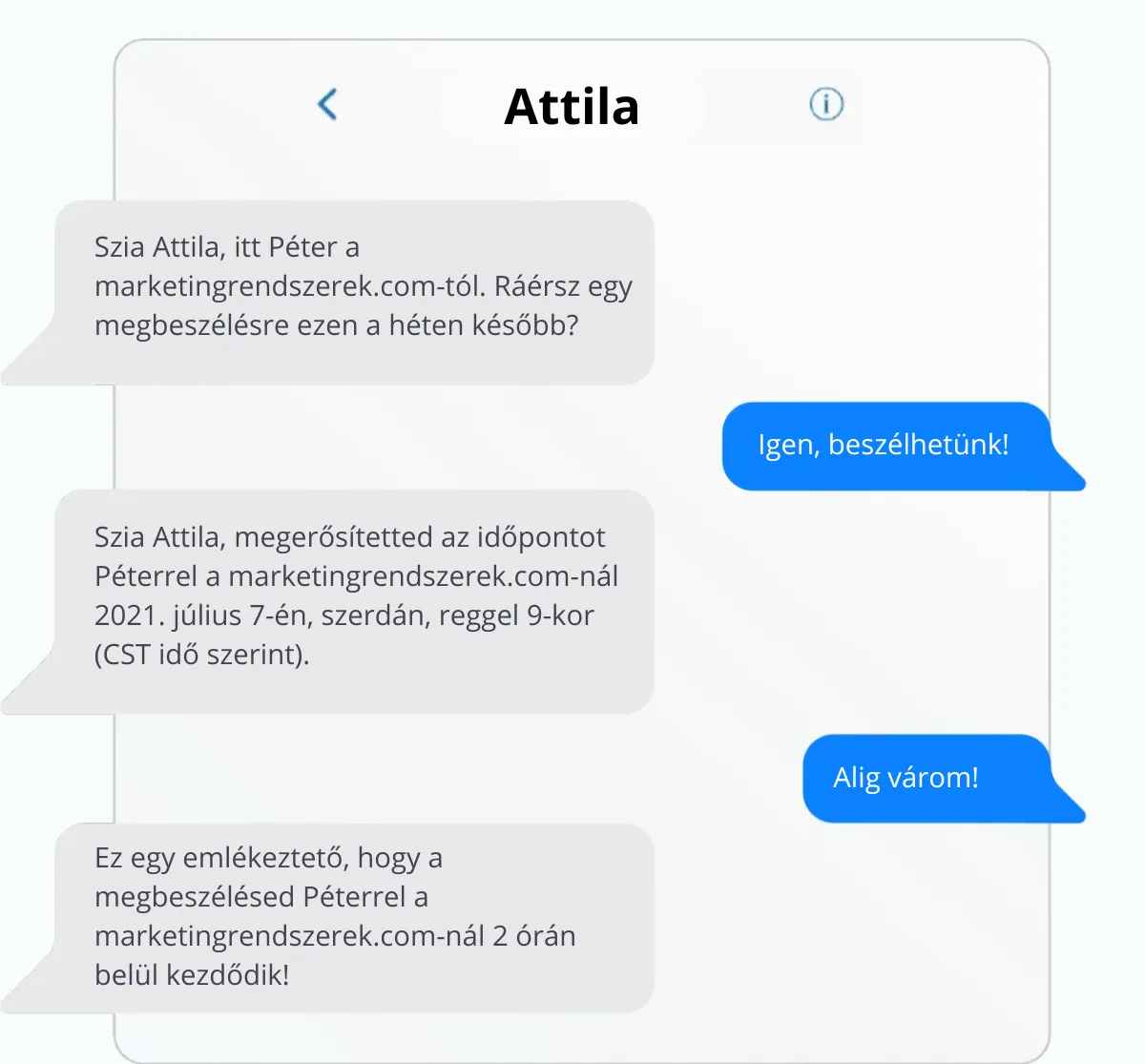 Elindítjuk és kezeljük a rövid üzenetváltásokat (SMS/e-mail/chat), hogy a foglalás megtörténjen — emberi beavatkozás nélkül.