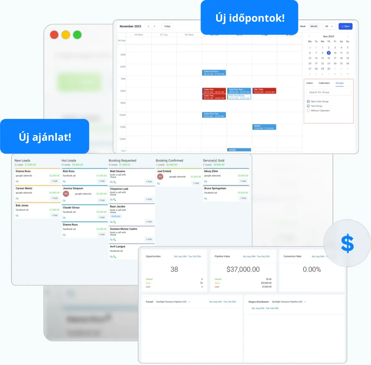 Weboldal, tölcsér, CRM, naptár és üzenetküldés — mind egy platformon, automatizálva.